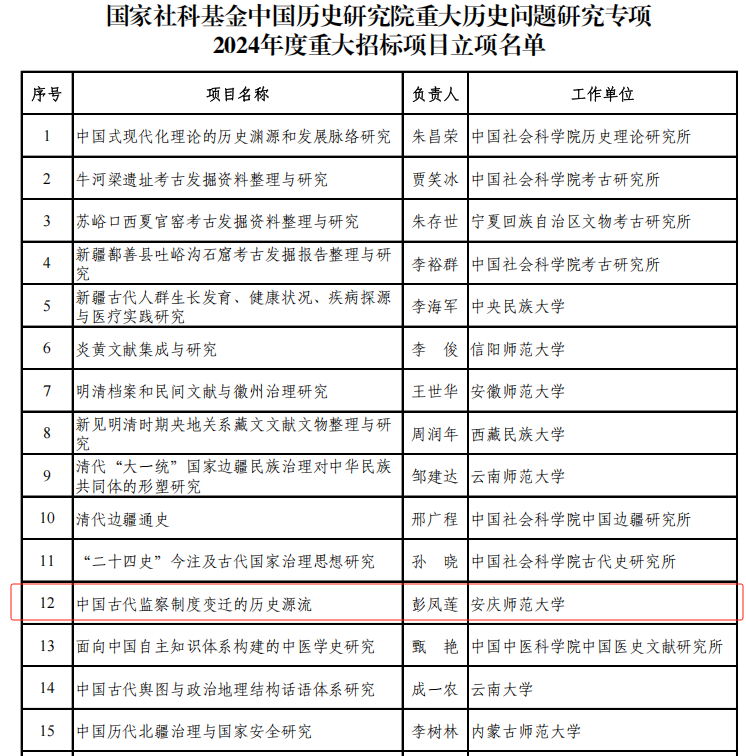 12月26日,全国哲学社会科学工作办公室公布《国家社科基金中国历史研究院重大历史问题研究专项2024年度重大招标项目立项名单》。beat365彭凤莲教授担任首席专家的“中国古代监察制度变迁的历史源流”项目获批立项。这是beat365首次获得国家社科基金中国历史研究院重大历史问题研究专项重大招标项目,也是beat365国家社科基金重大项目的历史性突破。
