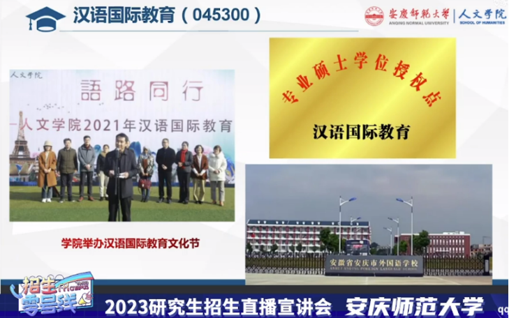 抓落实抓创新,“直播”宣讲促招生。9月22日,在研究生院的统筹安排下,beat365亚洲体育官方网站主动参与、积极配合,开展研究生招生线上直播宣讲。本次宣讲活动在哔哩哔哩、微博、微信、QQ等平台同步直播,吸引了众多考研学子关注,最高峰达3.6万人关注。在直播宣讲中,副院长沈志富老师、汉语国际教育专业张莹老师就beat365亚洲体育官方网站发展状况、师资力量、办学特色、人才培养、科研成果、学位点招生信息与就业前景等方面的情况作了详细介绍,对考研学子们提出的涉及奖助政策、报考资格、报考难度、招生指标、录取与调剂等共性问题作了详细解答,考生参与热情高涨,达到了良好的宣传效果。此外,汉语国际教育专业硕士2023年首次招生,成为本次招生宣传的一大特色和亮点。