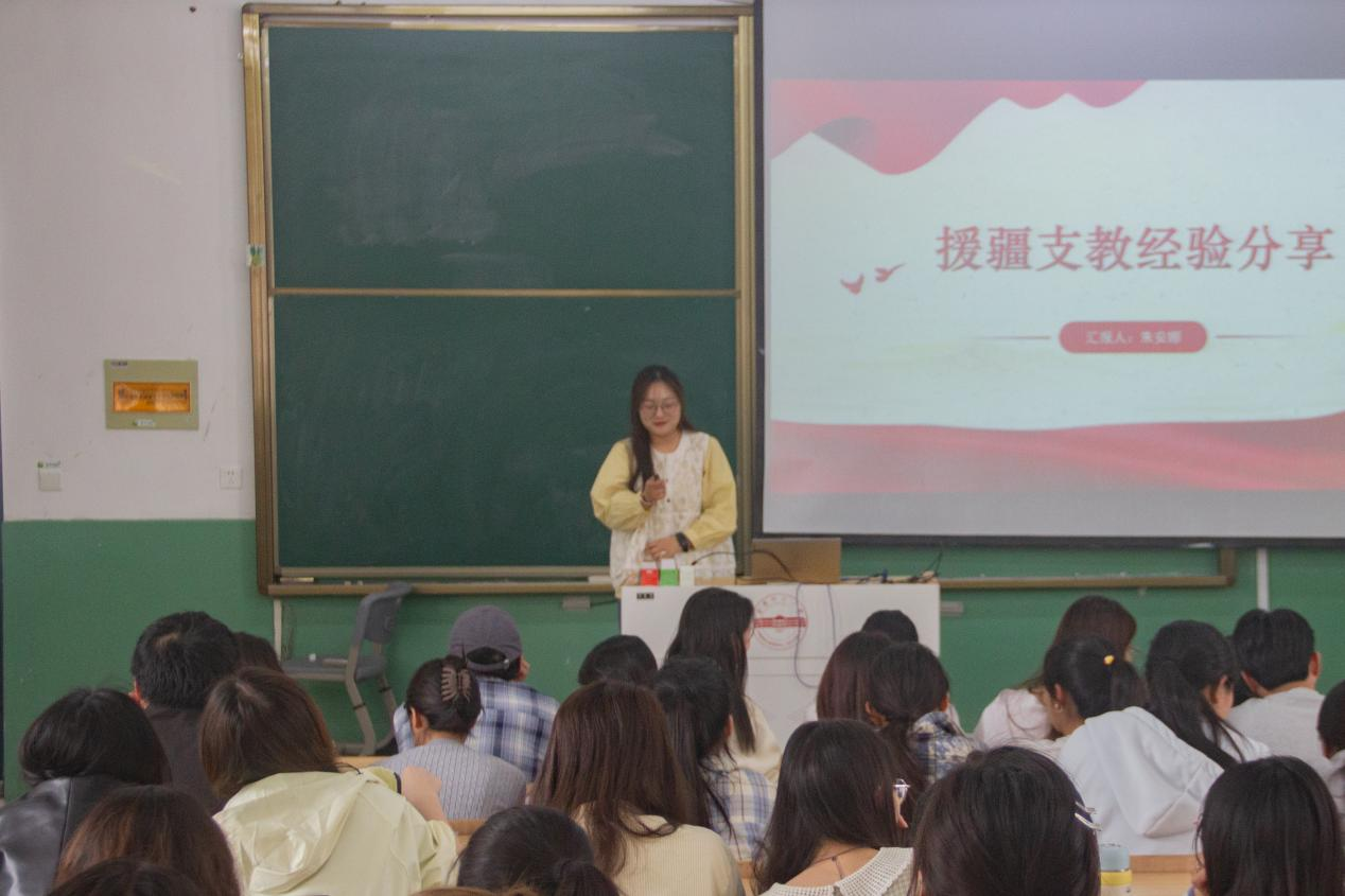 “作为新时代青年,我很荣幸能投身于祖国边疆的教育事业,为这片土地的教育发展添砖加瓦。”2023级学科教学(语文)专业朱安娜结合自身援疆经历,从初到援疆、教学工作、文化交流和支教感悟四个方面与在场人员分享援疆支教经验。她激励学生们积极响应国家战略,立足实际,发挥自身优势,努力在专业领域有所作为,形成良好的工作作风,发扬深入基层的实干务实、艰苦奋斗精神,展现青年人的蓬勃朝气与时代风采,在全心全意为人民服务中实现人生价值。“在支教过程中,师生间的深厚情谊是我人生中宝贵的精神财富,当地民族独特的文化魅力深深感染了我。”朱安娜表示,她会坚定为教育事业奋斗的决心,坚持把理论知识运用到实践当中,将自己的教育热情播撒在祖国的边疆。