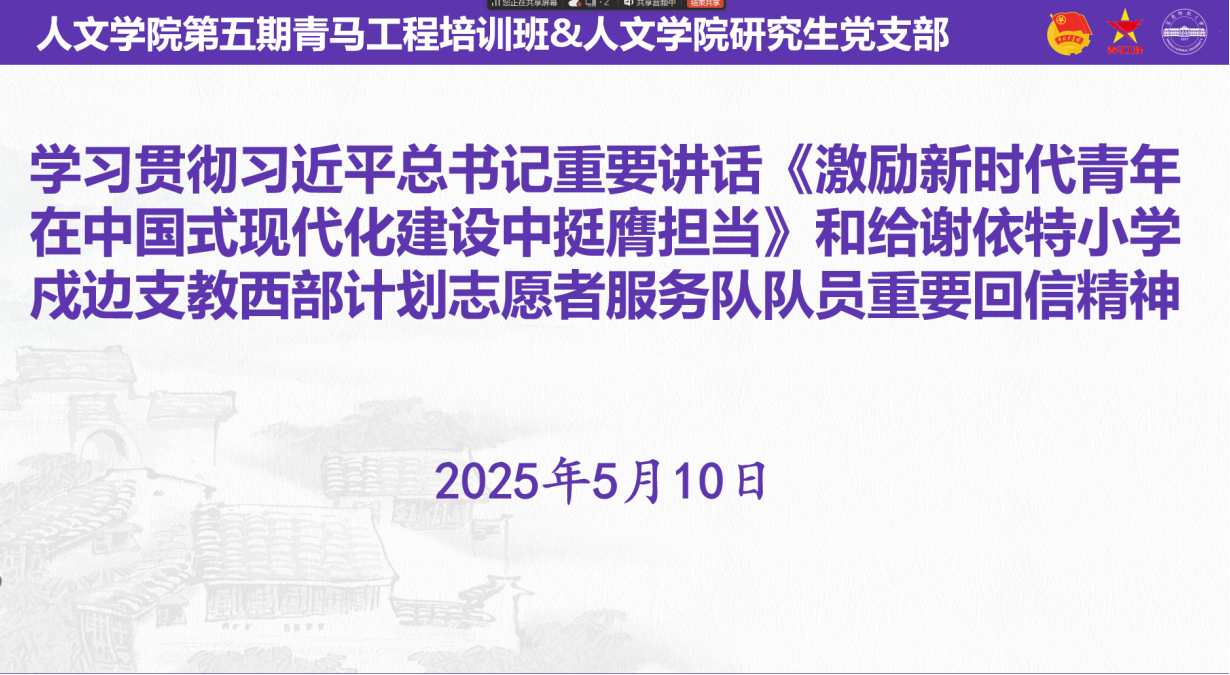 5月10日,beat365亚洲体育官方网站研究生党支部与第五期青马工程培训班举行线上会议,学习贯彻习近平总书记给谢依特小学戍边支教西部计划志愿者服务队队员重要回信精神,并邀请2021年西部计划志愿者、2024级学科教学(历史)专业程添星同学进行经验分享。