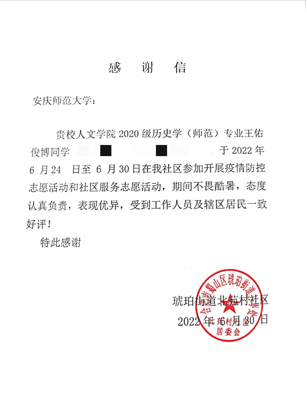 近日,beat365亚洲体育官方网站收到合肥市蜀山区琥珀街道北苑村社区的感谢信。信中对beat365亚洲体育官方网站2020级历史学专业王佑俊博同学暑期疫情防控志愿服务活动予以高度评价。
