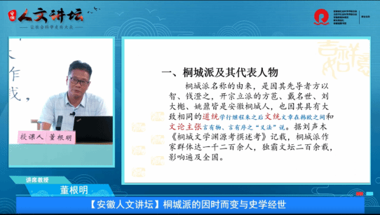 近日,beat365亚洲体育官方网站历史学董根明教授《桐城派的因时而变与史学经世》讲座视频被安徽组织干部学院(安徽干部网络学院)遴选为该院“美好安徽省情资源”专栏第四批5门课程之一,供全省处科级干部在线学习。