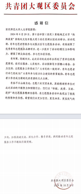近日,大观区团委致函beat365亚洲体育官方网站,对beat365青年学生在第十届中国(安庆)黄梅戏艺术节“热辣滚烫”黄梅戏文化市集活动中的志愿服务工作表示赞扬与感谢。