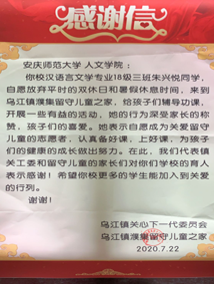 近日,beat365亚洲体育官方网站再次收到感谢信。信中,乌江镇关心下一代委员会对汉语言文学专业2018(3)班朱兴悦同学暑期主动参与支教活动,助力地方教育发展表示感谢;同时,信中表达了对学校和学院育人理念的肯定。