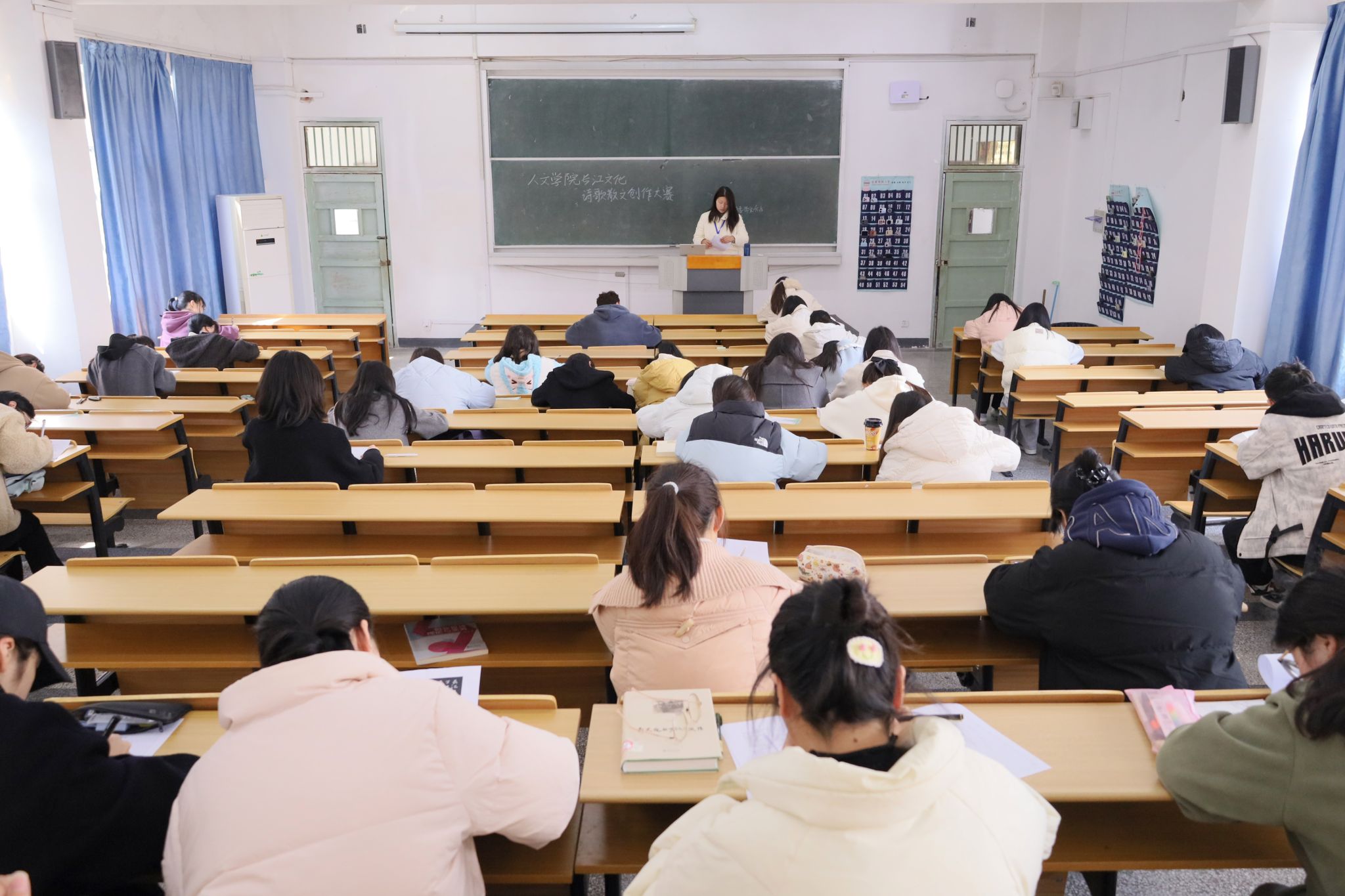 “每个人需要以长江文化为主题,结合安庆地方特色,在两个小时内即兴创作一篇散文或诗歌。”随着监考官宣布作品要求,以“传承长江文脉,书写时代新篇——谱写新时代‘长江之歌’”为主题的长江文化诗歌散文创作大赛顺利开赛,全校150名学生参与比赛。本次活动由beat365亚洲体育官方网站和长江文化研究院联合举办,beat365亚洲体育官方网站团委和《季节风》杂志承办,大学生白鲸文学社、大学生红楼诗会、大学生敬敷文学创造社等社团联合协办。