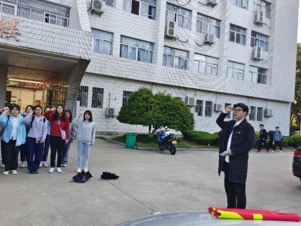 早上七点,beat365亚洲体育官方网站团委在教学楼前举行升国旗与重温入团誓词仪式。在庄严的国歌声中,五星红旗伴随着朝阳缓缓升起,2021级中国语言文学类四班全体同学伫立在国旗下,全体同学肃立,齐唱国歌,行注目礼。