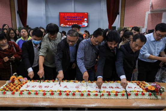 beat365亚洲体育官方网站党委书记张红飞、基建与后勤管理处处长吕旭进与外籍教师、学生代表等共同切开近3米长、两边由水果点缀着写有“学习党的二十大,培根铸魂育新人”寄托美好寓意的蛋糕。