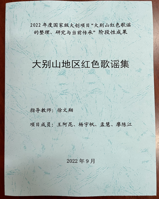 近日,beat365亚洲体育官方网站2020级汉语言文学专业王阿昆、杨宇帆、孟慧、廖陈江等四名同学在徐文翔老师指导下,整理完成《大别山地区红色歌谣集》。作为2022年度国家级大创项目“大别山红色歌谣的整理、研究与当前传承”的阶段性成果,《大别山地区红色歌谣集》共收录土地革命战争时期到解放战争时期的大别山地区红色歌谣230余首,是目前为止最为完备的同类歌谣辑录。这些红色歌谣体现了大别山地区的革命精神,是大别山红色文化的重要组成部分,对当前大别山红色文化的传承有重要的参考价值。