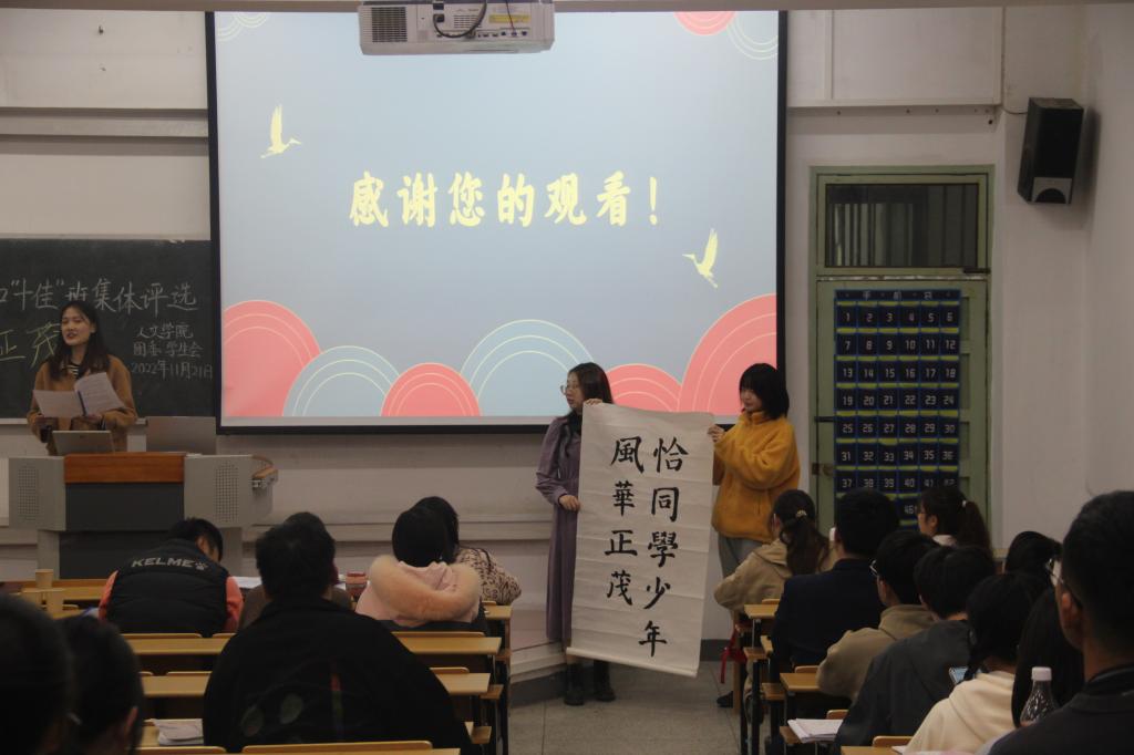 各班通过列数据、制作饼状图等方式对四六级通过率、党团活动、体测达标和评优情况进行汇报。直观具体成果展示,体现了本班在德智体美劳多方面取得的丰硕成果。而乐器表演、书法展示更是把评选现场的气氛推向高潮。其中,2021级汉语言四班的汇报展示融合了磅礴大气的钢琴和宛转悠扬的古筝乐,充分展现beat365亚洲体育官方网站的文化专业底蕴,赢得了在场观众的阵阵掌声。