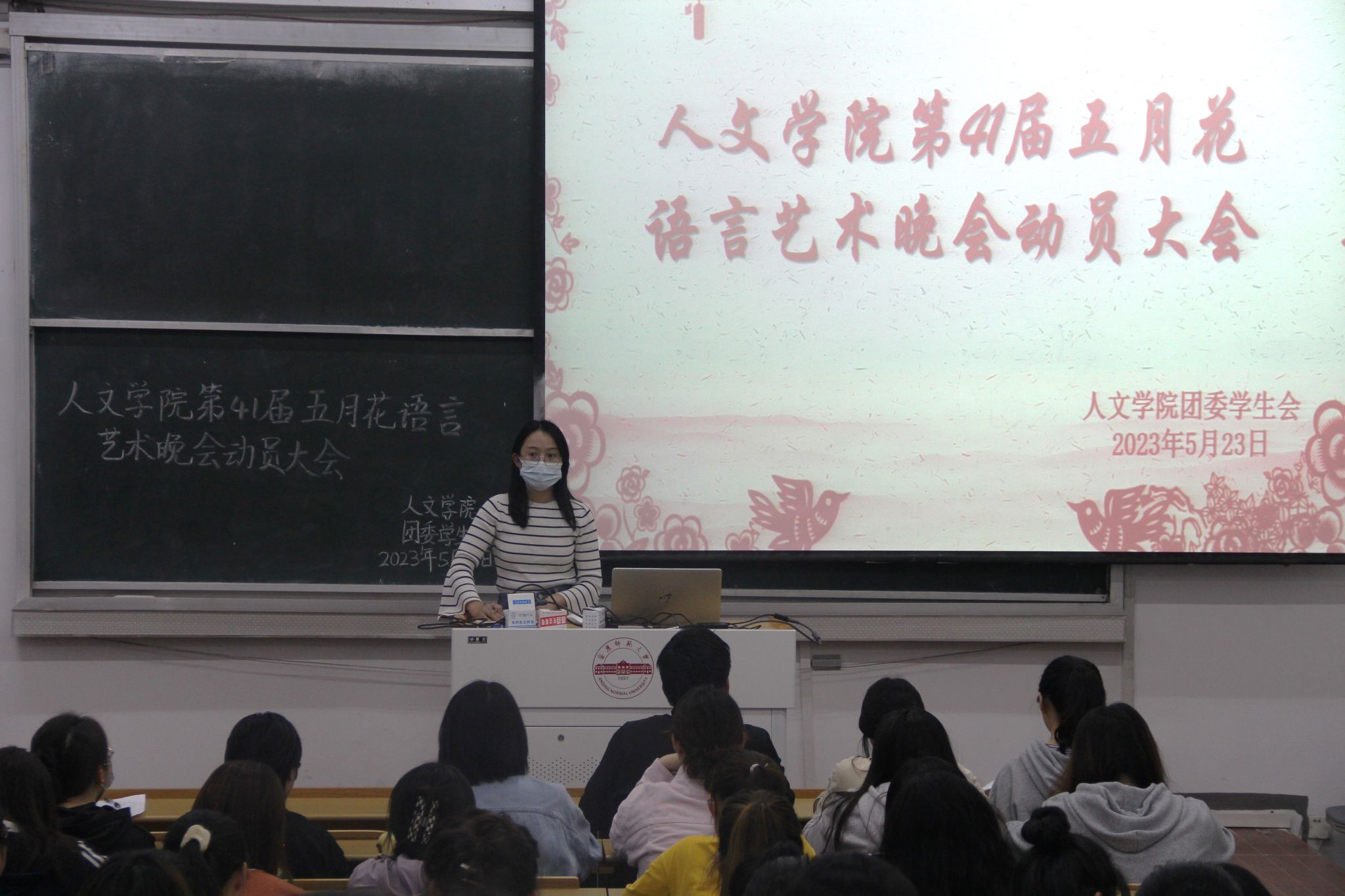 洪星星提出几点要求,要做好节目预案,防止突发事件;要求进一步细化职责,各部门应坚守岗位、各尽职责;要做好保存管理工作,避免造成不必要的损失。最后强调了各班级在后续进场观看节目时相关注意事项。
