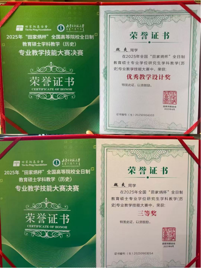 全国“田家炳杯”全日制教育硕士专业学位研究生学科教学(历史)专业技能大赛是目前教育硕士培养领域层次最高、规模最大、影响力最广的全国性大赛。本次赛事分初赛和决赛两个阶段。初赛线上举行,选手围绕初中新教材《中国历史·七年级上册》自选课程进行设计,提交教学设计和10分钟教学视频。决赛线下举行,分为现场抽题、限时备课、现场授课、即时答辩四个环节,综合考察选手对历史学科知识的熟练掌握程度,以及选手快速教学设计、课堂驾驭能力和临场应变能力。经过激烈角逐,齐扬同学获二等奖和优秀教学设计奖,魏爽同学获三等奖和优秀教学设计奖,董根明教授荣获“优秀指导教师奖”。