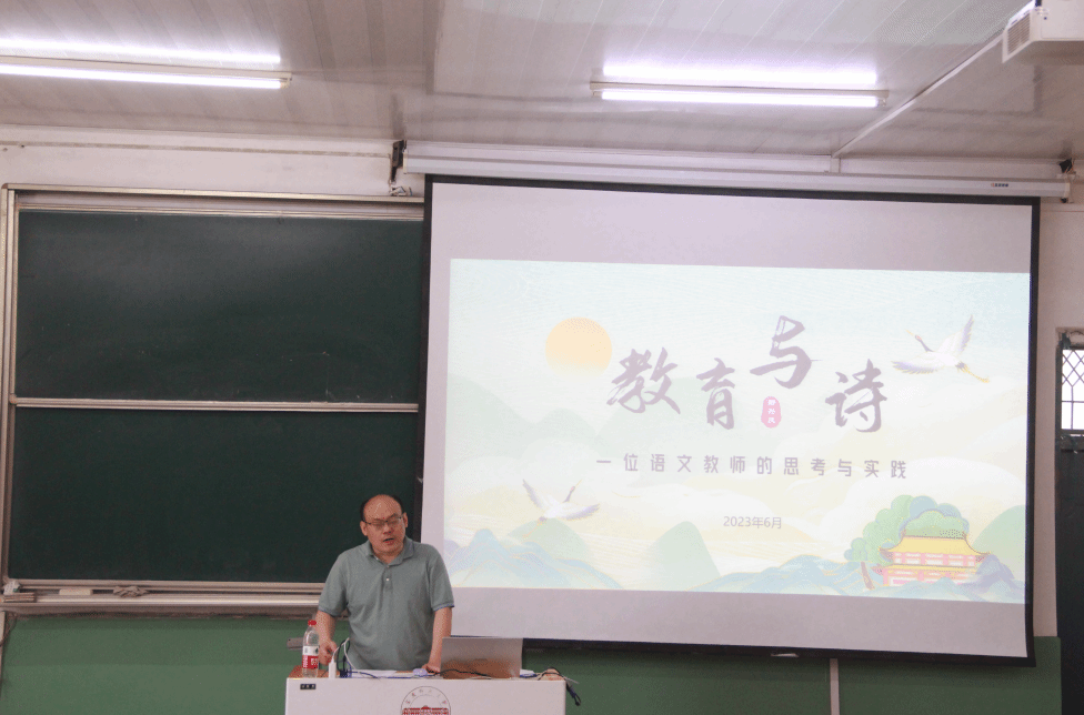 6月2日下午,文典·教育名家讲坛第二讲在菱湖校区化学楼理二阶开讲。本次报告邀请了安庆市第一中学副校长舒兴庆做题为“教育与诗——一位语文教师的思考与实践”的专题讲座。讲座由副院长金松林教授主持,beat365学科语文、学科历史两个方向的硕士研究生以及部分本科生到场聆听学习。