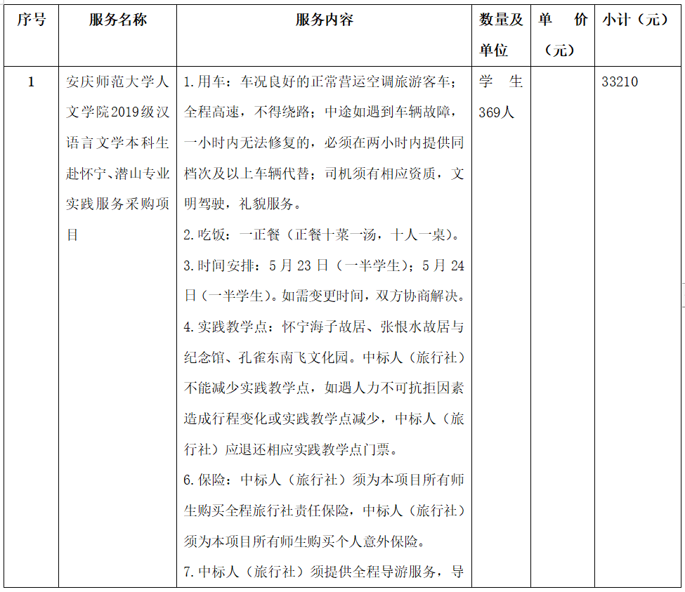 2.采购项目名称:安庆师范大学beat365亚洲体育官方网站2019级汉语言文学本科生赴怀宁、潜山专业实践服务采购项目