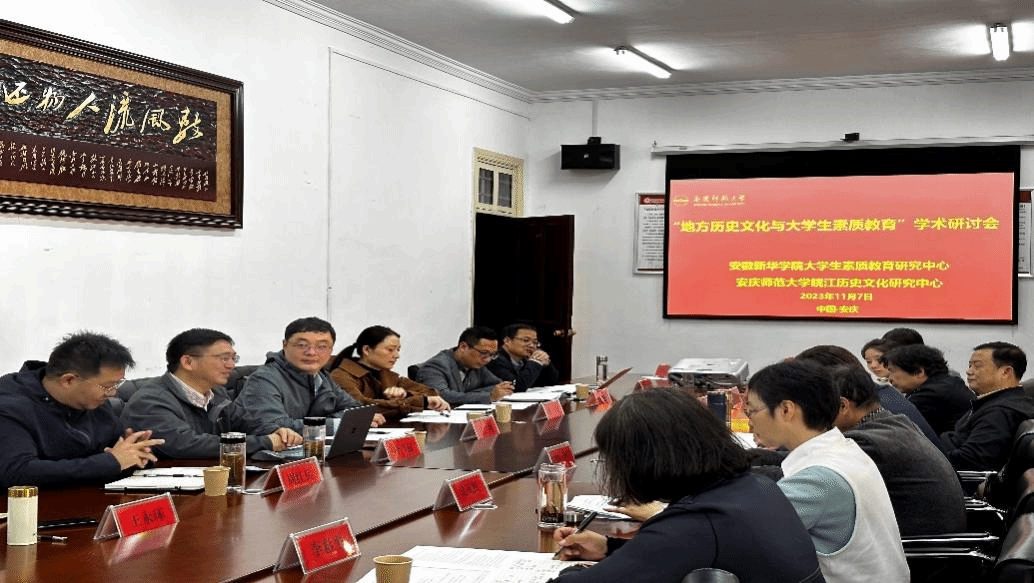 11月7日,安庆师范大学皖江历史文化研究中心与安徽新华学院大学生素质教育研究中心在菱湖校区红楼会议室联合举办“地方历史文化与大学生素质教育”学术研讨会。安徽大学、安徽建筑大学、阜阳师范大学、安徽新华学院等高校专家出席会议。