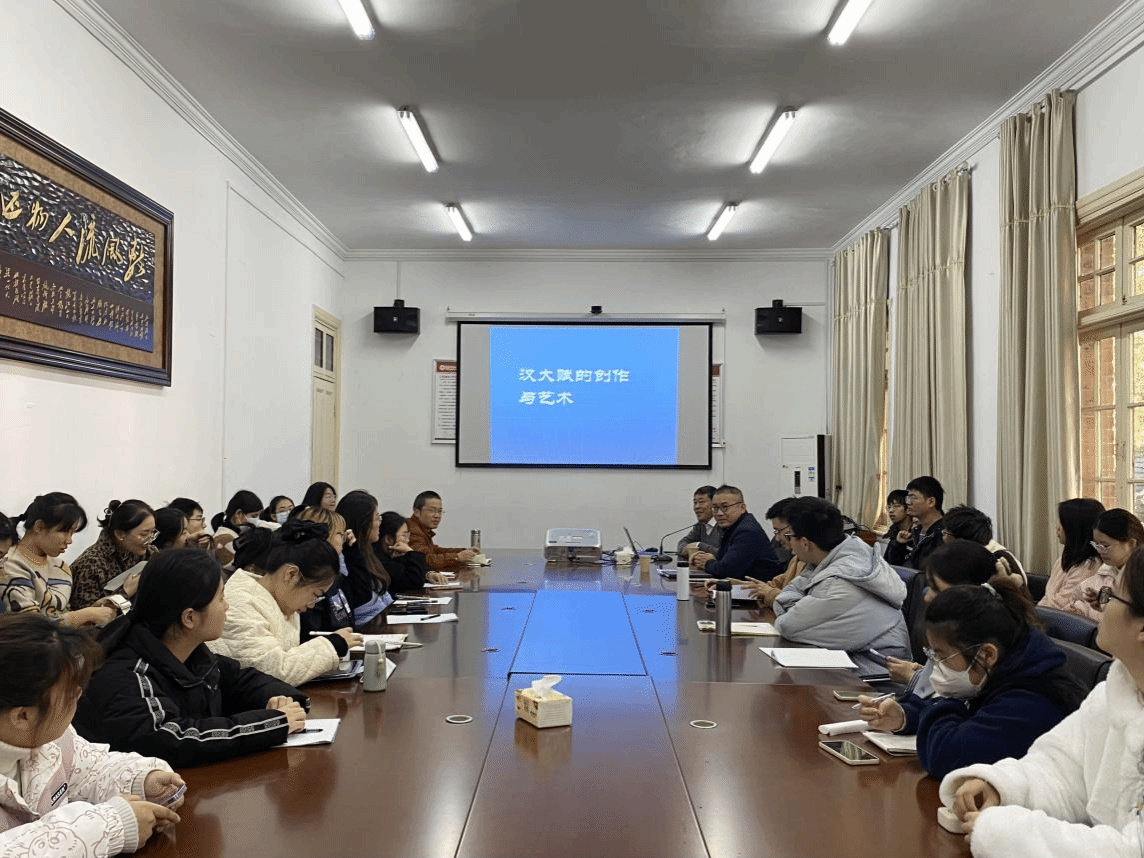 许结教授结合大量的汉赋作品,从职官身份、礼乐制度、京都文明三个角度,论述汉大赋的兴盛,进而分析汉大赋作为雅文学的艺术特征、汉大赋创作对后世文学之影响,及其对当今文化建设的启发。许教授分享了自己多年对汉大赋研究的体会,鼓励大家在学习和研究的过程中要进行文本细读,深入感受传统文化的魅力。讲座结束后,他和与会师生还进行了深入交流。