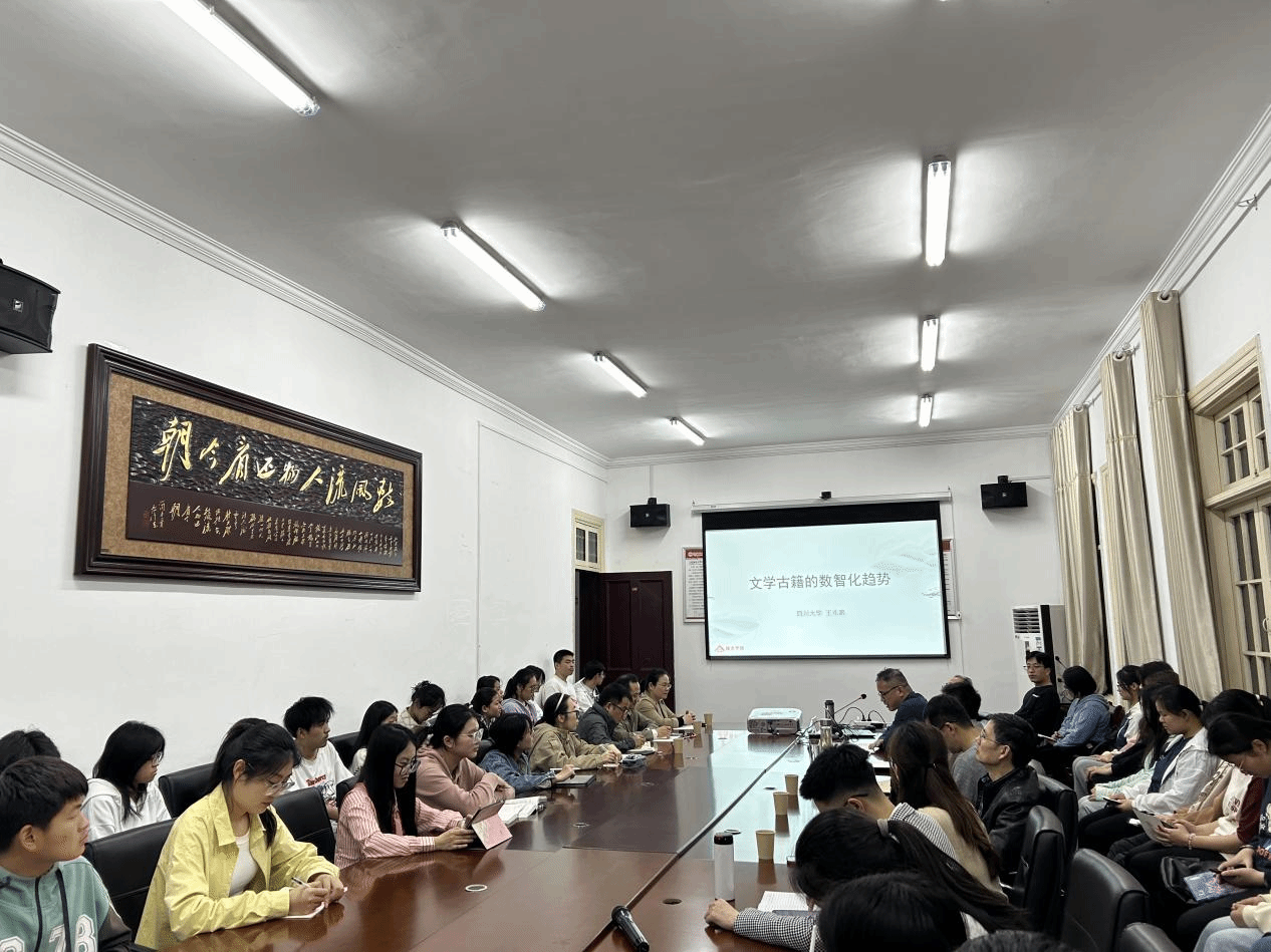 4月22日,四川大学王兆鹏教授应邀做客敬敷人文讲坛,主讲题为“文学古籍的数智化趋势”学术讲座。本场讲座由皖江文化数字化保护与智能处理重点实验室承办,院长汪孔丰教授主持,beat365部分教师及研究生、本科生参加了此次活动。