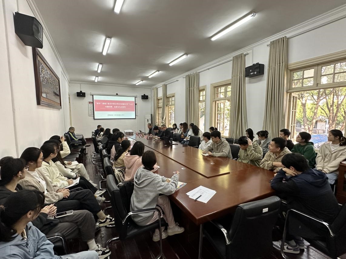 钟进文教授的讲座主要从“重写中国文学史与多民族文学史观建构”“中国文学史编写与民族文学‘入史’问题回顾”“中国少数民族文学创作‘转向’与民族文学‘入史’问题”“‘铸牢’视域下重写中国文学史与民族文学‘入史’新思考”等四个方面展开。钟教授指出,中国当代文学史在新时期三十多年的编写过程中,对于少数民族文学的历史叙述经历了从“有意”叙述到“有限”叙述,再到“差异”叙述,最后到“零叙述”的巨大变化,不仅存在语言障碍、翻译滞后、话语权之争、文学与文化认同等表层原因,还存在当代少数民族文学创作的重大转向这一深层原因。他希望通过本次学术交流,启发大家换个角度思考中国文学史,并从国家铸牢“文化自信”、重编教材动态和专业学科发展等角度阐述重写文学史的必要性。