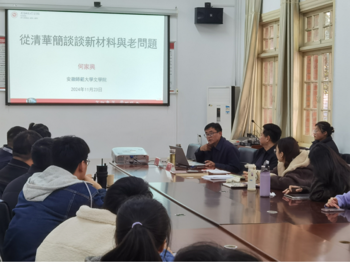 11月23日,安徽师范大学文学院教授、博士生导师何家兴应邀做客敬敷人文讲坛,在红楼二楼会议室作了题为“从清华简谈谈新材料与老问题”的学术讲座。本次讲座由陈世庆教授主持,beat365部分青年教师、研究生和本科生参加了此次活动。