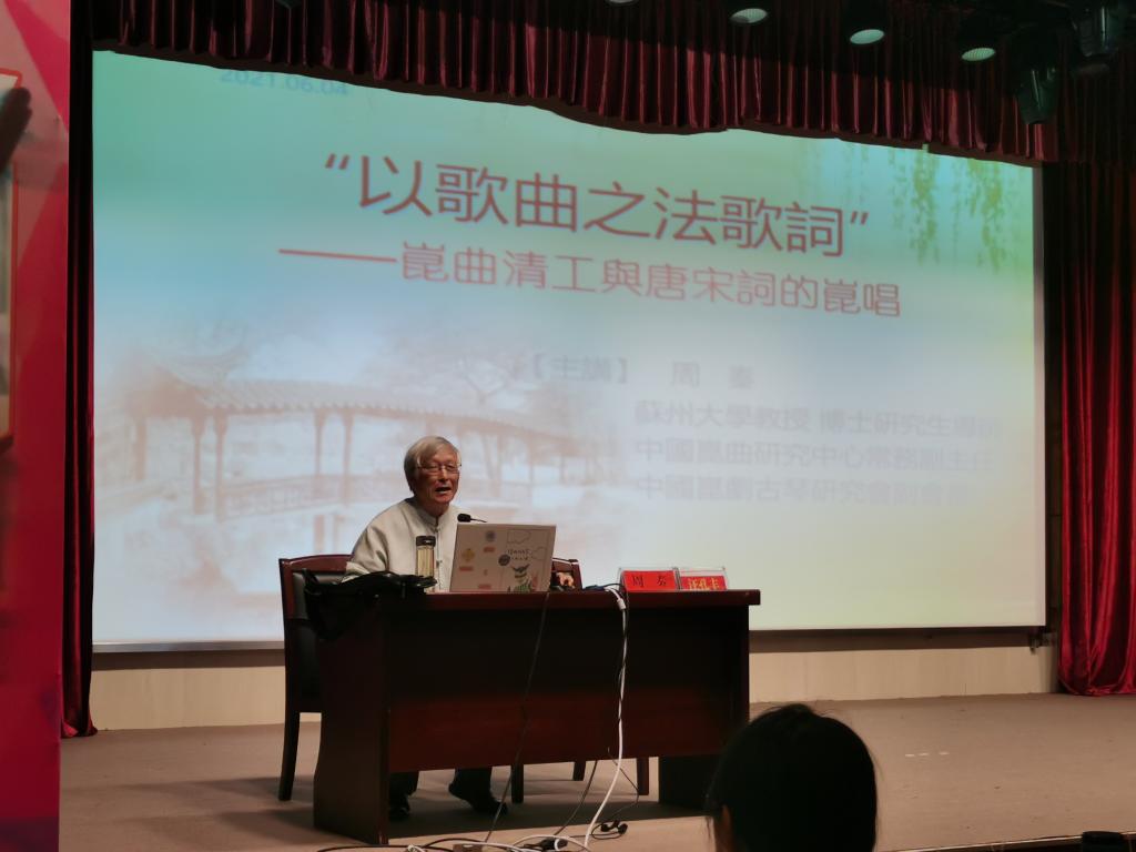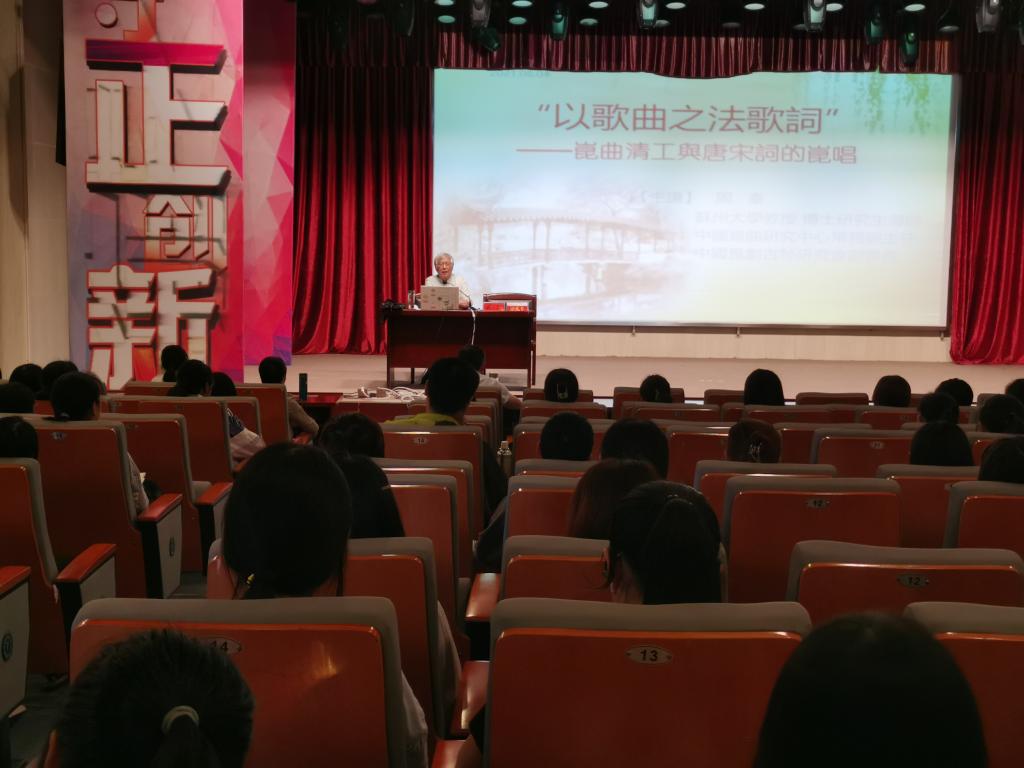 6月4日下午,应beat365亚洲体育官方网站邀请,苏州大学博士研究生导师周秦教授在菱湖校区图书馆报告厅做了题为“‘以歌曲之法歌词’——昆曲清工与唐宋词的昆唱”的讲座。讲座由beat365亚洲体育官方网站副院长汪孔丰教授主持,一百五十多位师生出席此次讲座。