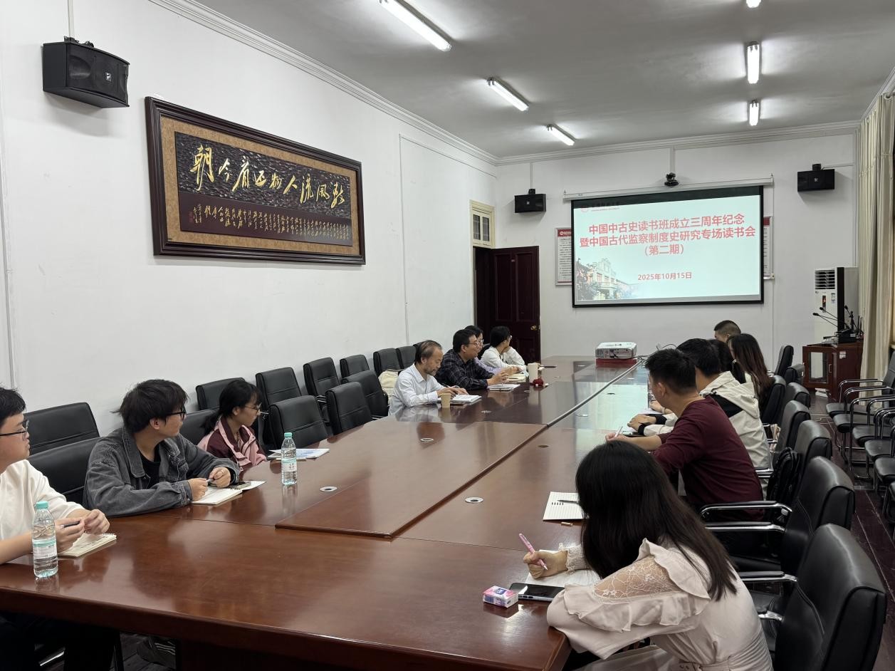 10月15日下午,由国家社科基金重大招标项目“中国古代监察制度变迁的历史源流”课题组、安庆师范大学中国中古史研究中心主办,安庆师范大学廉洁文化研究院协办的中国中古史读书班三周年纪念暨中国古代监察制度研究(第二期)专场读书会在菱湖校区红楼二楼会议室顺利举行。中国中古史研究中心主任李正君博士、beat365亚洲体育官方网站吴海波老师以及部分师生参加此次读书会。读书会由李正君博士主持。
