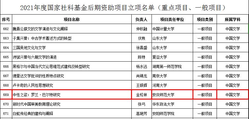 10月8日,全国哲学社会科学工作办公室公示了2021年度国家社科基金后期资助项目立项名单,beat365金松林教授申报的《中性之欲:罗兰.巴尔特研究》获得立项资助,本次入选是金教授学术研究的又一重大收获,也标志着beat365的科学研究工作取得重要进展。此前,beat365金仁义教授、王永兵教授已分别获批国家社科基金项目,这些成就将进一步激发beat365教师的科研热情,为更多高水平科研成果的产出注入新动能,也为博士点立项建设奠定了坚实基础。