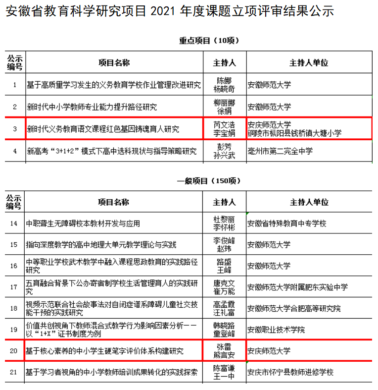 10月8日,安徽省教育厅公示了2021年度教育科学研究项目课题立项评审结果,包含重点项目10项,一般项目150项。beat365芮文浩副教授的《新时代义务教育语文课程红色基因铸魂育人研究》获批重点项目。张雷老师、熊言安副教授的《基于核心素养的中小学生硬笔字评价体系构建研究》获批一般项目。beat365高度重视科研工作,两项教育研究项目的入选是beat365在学科建设和科研方面取得的重要收获,相关成果对汉语言文学专业认证工作也将起到积极作用。