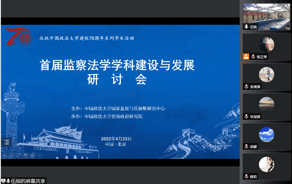4月23日,由中国政法大学国家监察与反腐败研究中心主办,中国政法大学法治政府研究院承办的“首届监察法学学科建设与发展”研讨会以线上与线下相结合的方式召开。会议邀请了中国法学领域尤其是监察法学方向的数十名专家参与,会议日程主要涉及监察法学学科属性及定位、监察法学基本研究范畴以及监察法学教学方法与研究方法等前言议题。beat365李正君博士也应邀参与了此次研讨会。