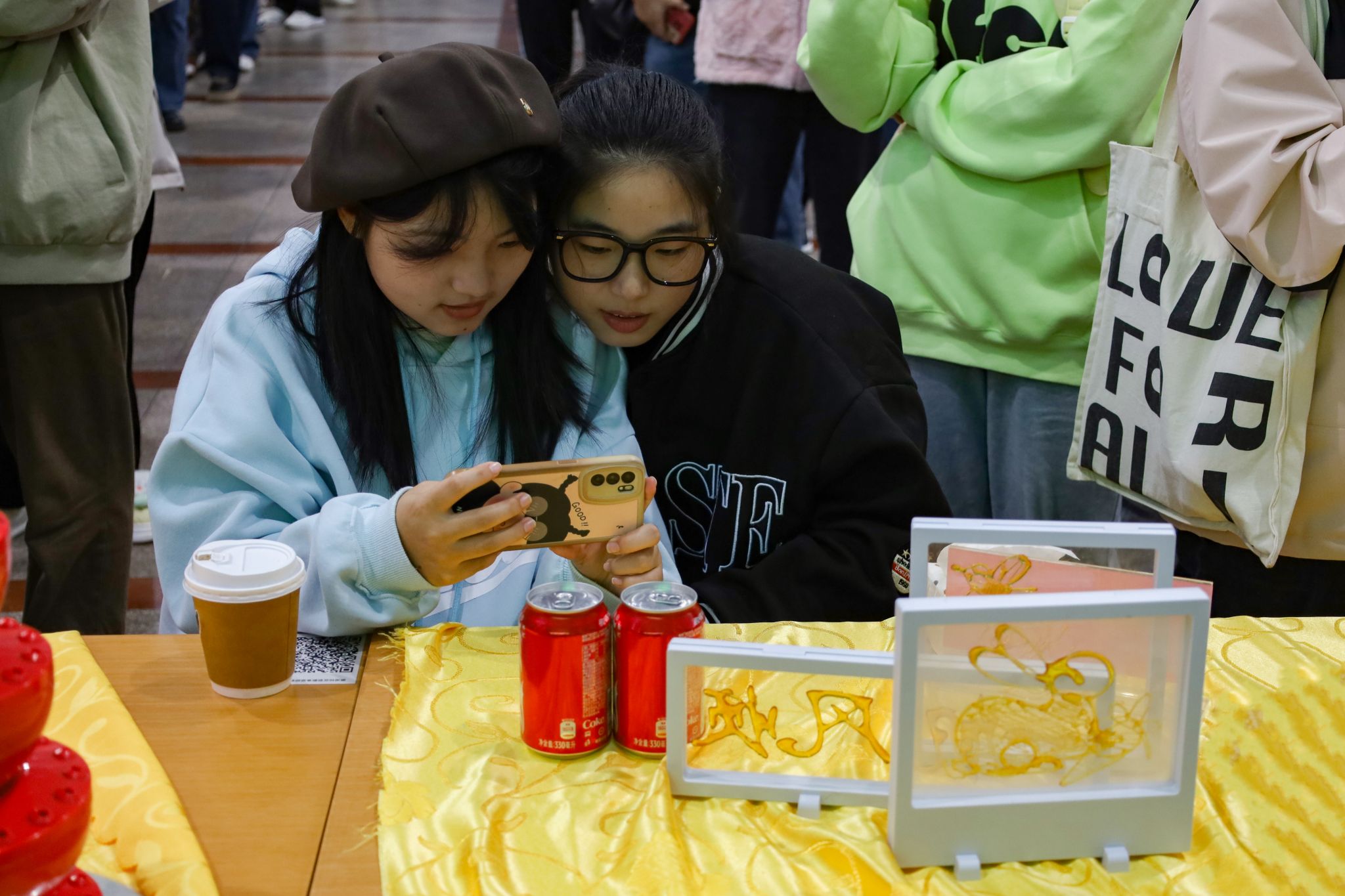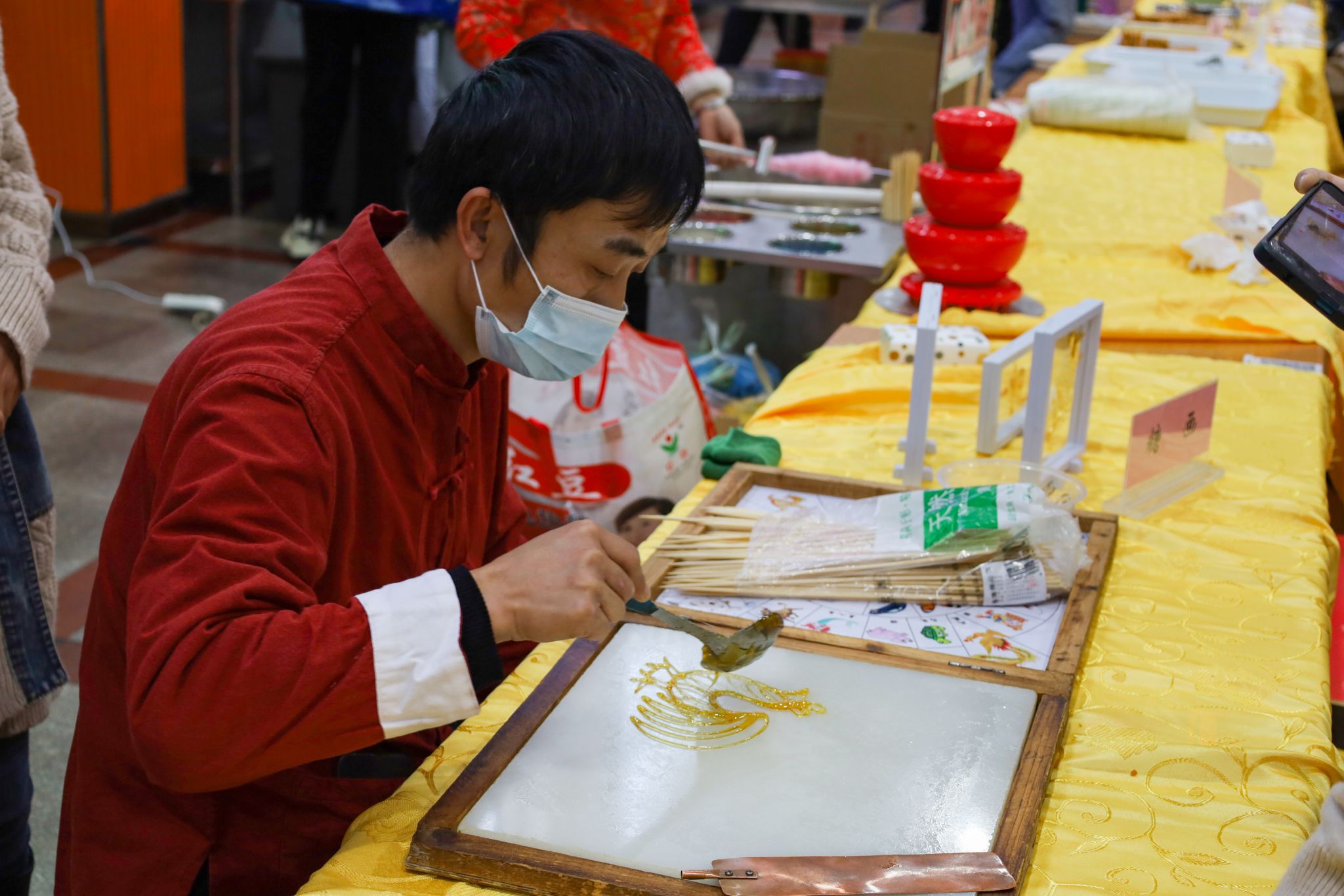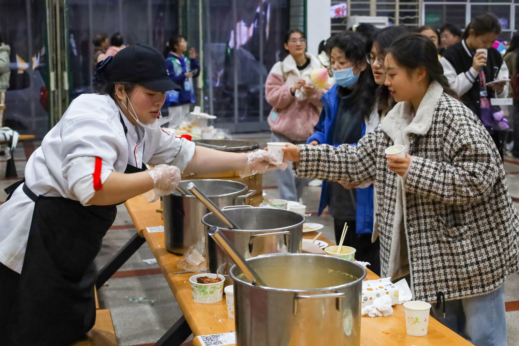 拉面、糖画等中国传统非遗美食成功刷屏了在场师生的朋友圈,成为现场的一大亮点。糖画师傅早早地熬好糖浆,缕缕金黄糖丝自汤勺中泄下,随着师傅快速地移动手肘,一只栩栩如生打鸣的公鸡便在他手下诞生。负责制作棉花糖的阿姨也在准备中,各色的棉花糖自炉中跳出,阿姨手握一根竹签,在炉内转动,一只彩色小兔便已成形。拉面师傅表演着独家绝技,只见胖墩墩的面团在他的双手中上下舞动拉扯,变成了细长的面条,下入锅中,袅袅白雾给寒冬中beat365亚洲体育官方网站的学子送去“温暖”。