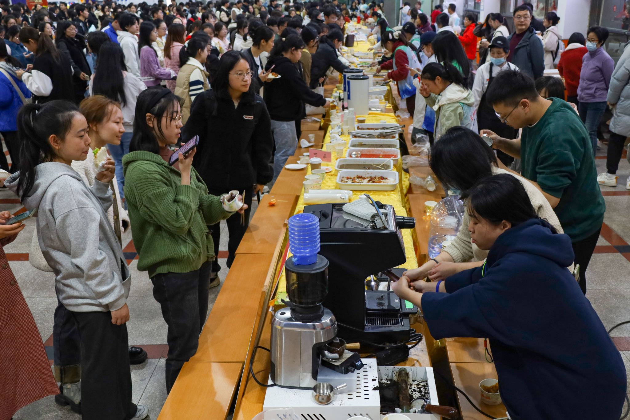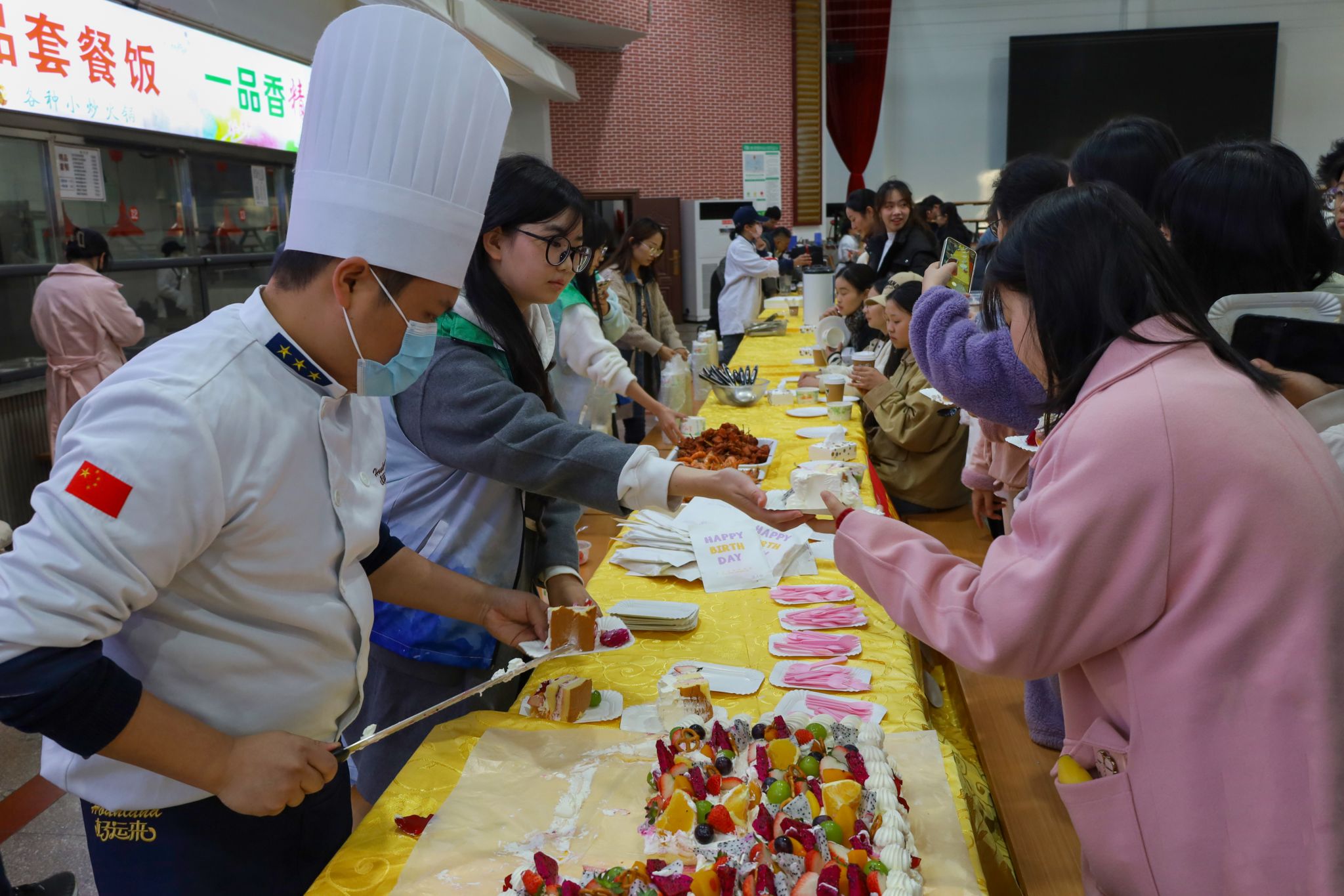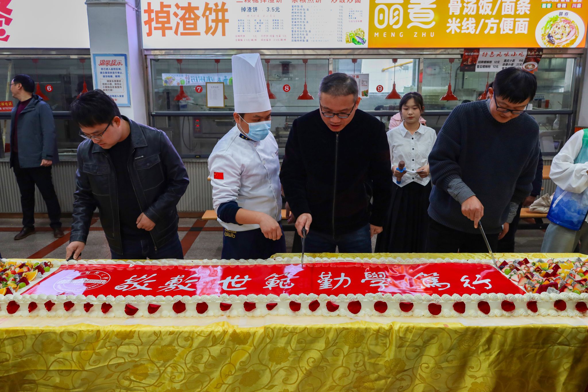基建与后勤管理处副处长查国平、beat365亚洲体育官方网站副院长汪孔丰及安徽中快餐饮有限公司总经理何伦共同切开印有 “敬敷 世范 勤学 笃行” 校训和校徽字样的、并由水果点缀的大蛋糕,宣告着美食节正式拉开序幕。三明治、甜甜圈、泡芙、咖啡等各类西式甜点饮品整齐排列,中式美食糖醋排骨、红烧肉、金牌猪脚等秀色可餐,传统糕点烧卖、发糕、燕麦粥等食品也给现场平添了许多“烟火气息”。