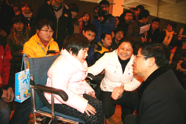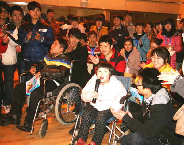 这群特殊的客人是安庆市的6位脑瘫儿童,今天他们来参加的是文学院响应“万人学雷锋”活动之“汇爱”助残联谊会。
