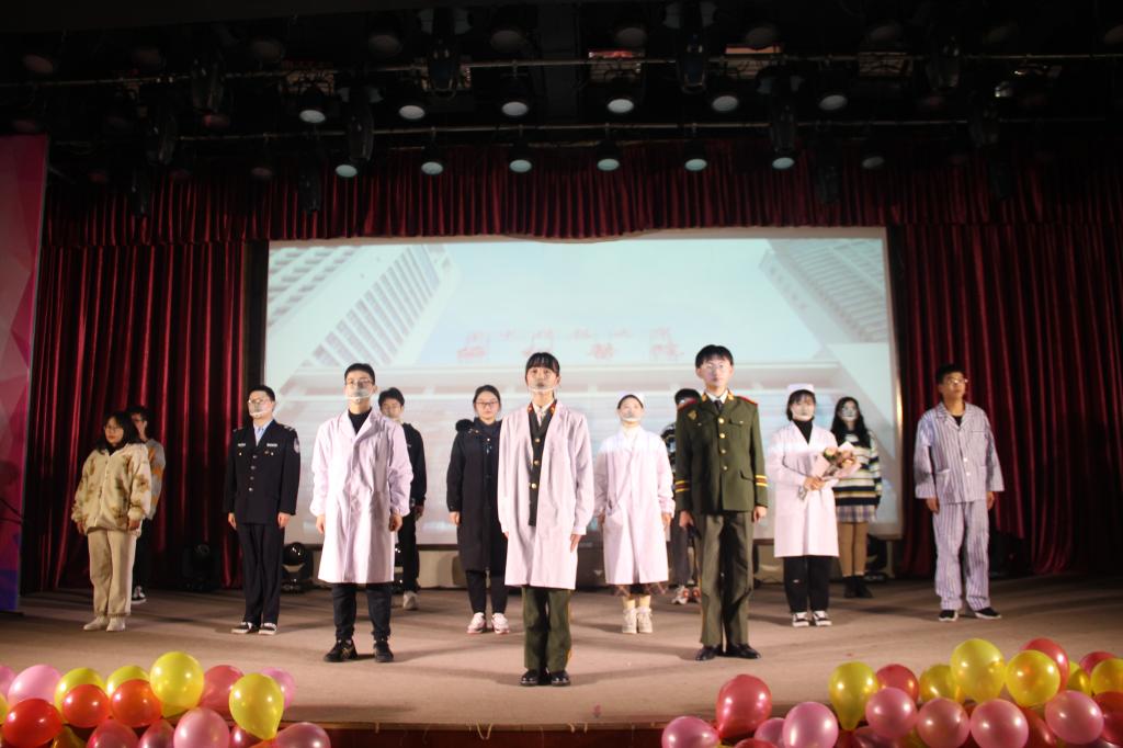 2019级汉语言文学一班艾宇龙说:“2020年是抗疫之年,在疫情期间,涌现出无数平民英雄,谱写了无数动人的篇章。为致敬这些伟大的英雄们,beat365话剧社自编自导,原创话剧《黎明之前》。”话剧由警察在疫情期间阻止居民外出、军人母亲自愿奔赴抗疫前线、基层医生的防疫工作逐步得到群众理解等不同片段组成。演员们饱含深情,充分投入到表演之中,将观众带入不同的故事,再现了抗疫过程中医疗战士迎难而上和坚守岗位的感人画面,赢得现场一片掌声。