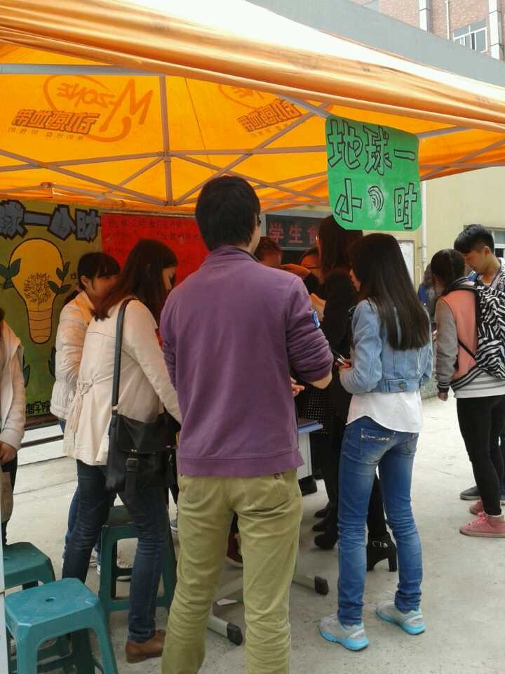 今年的“地球一小时”活动以“告别雾霾,蓝天自造”为主题。通过签字活动、微博、倡议书等形式邀请同学们承诺在3月29日晚上8:30-9:30熄灯一小时。在工作人员的悉心讲解下,同学们认真了解,积极参与,纷纷签下自己的名字,用行动表达对“地球一小时”活动的响应,并积极佩戴绿丝带,加入环保志愿者的队伍。