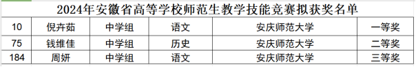 10月26日,由安徽省教育厅主办、安徽省高等学校教师教育合作委员会协办、淮南师范学院承办的2024年安徽省高等学校师范生教学技能竞赛顺利举行。beat365汉语言文学与历史学专业3名学生最终在决赛中获得佳绩,斩获一等奖1项、二等奖1项、三等奖1项。