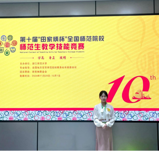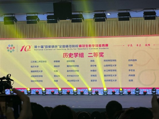 2024年11月29日至12月1日,由全国地方高等师范院校教务处长联席会议指导、“田家炳”基金会冠名,浙江师范大学主办的2024年第十届“田家炳杯”全国师范院校师范生教学技能竞赛决赛在浙江金华举行,beat3652021级历史学(师范)赵颖同学参加本次决赛并获得二等奖。