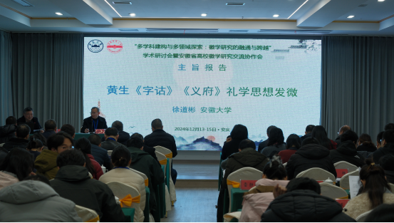 来自徽学研究中心和各分中心的9位专家带来了精彩的主旨报告,分别是安徽大学徐道彬教授《黄生<字诂><义府>礼学思想发微》、安徽师范大学刘道胜教授《图甲户籍与清代基层治理》、安徽建筑大学刘仁义教授《徽州历史文化保护传承之融通与跨越》、安徽中医药大学黄辉编审《新安医学对徽文化的贡献》、安庆师范大学梁诸英教授《民国时期皖南香菇业发展探析》、黄山学院朱宏胜副教授《从旧学到新知:徽文化史上的不疏园和韬庐》、安徽艺术学院夏守军副教授《基于考古发现武王墩一号墓装饰艺术初探》、阜阳师范大学刘家富副教授《本世纪以来近代徽商研究的回顾与思考》、淮北师范大学卢东博士《社会转型视域下明中后期徽州宗族的文化生活及其活动空间》。安庆师范大学学报编辑部主任金仁义教授、安徽大学徽学研究中心陈瑞研究员主持了主旨报告。