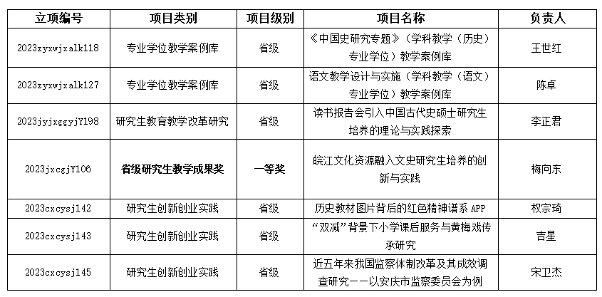 日前,安徽省教育厅公布了2023年度新时代育人质量工程项目(研究生教育)立项名单,beat365亚洲体育官方网站师生再创佳绩,共有4个类别7个项目获批立项,充分展示了学院在研究生教育领域的良好基础和深厚实力。具体情况如下: