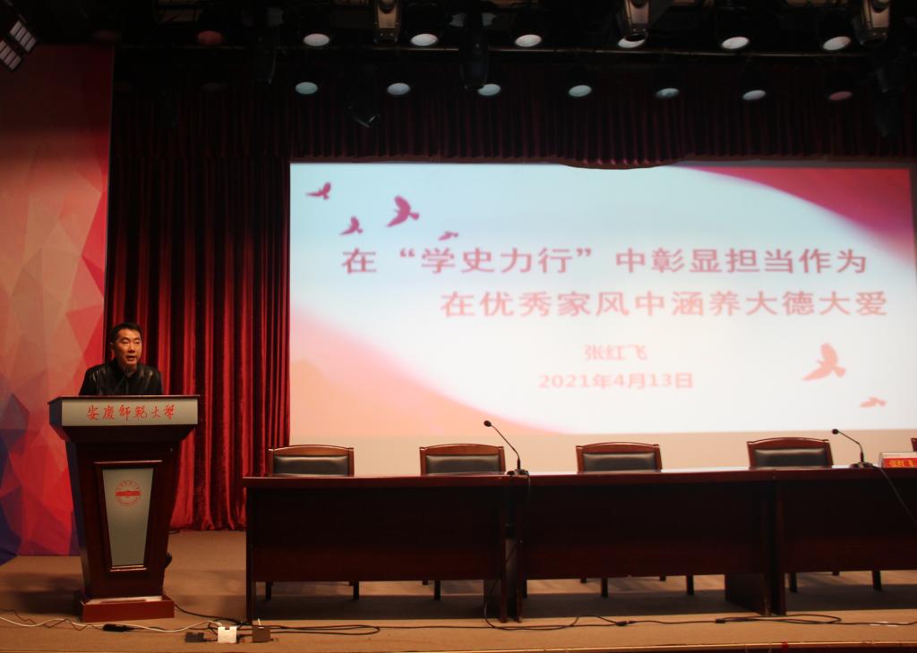 4月13日晚,beat365亚洲体育官方网站在菱湖校区图书馆报告厅举办家风建设学习教育暨专题党课报告会。学院党委书记张红飞出席会议并作了题为“在‘学史力行’中彰显担当作为 在优秀家风中涵养大德大爱”的专题党课报告。全体学生党员参加会议,会议由党委副书记王波主持。