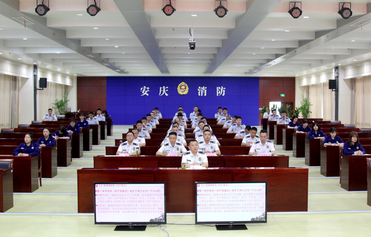 作为双方共建实践基地的重要内容之一,安庆师范大学beat365亚洲体育官方网站组织专业教师队伍,赴安庆消防救援支队开展党史宣讲,践行党史学习的时代使命。在活动之初,校地双方通过细致深入沟通,针对党史学习的基本要求,初步拟定党史宣讲方案。整个宣讲按照中国共产党百年发展历程,同时结合党史学习途径的多样化需求,基本确立了“百年党史的通史+地方党史”讲授体例。内容主要涵盖中国共产党成立以来的百年辉煌历程,结合安徽地方红色革命文化资源(大别山红色精神、渡江精神、小岗精神)以及安庆地方党史的特色内容。在充分酝酿的基础上,宣讲内容精选凝练出“日出东方”“古田会议”“长征力量”“解放战场”“新中国辉煌”“改革开放”“新时代信仰”等10个专题。同时,为了增强党史宣讲实效,在党史内容遴选和宣讲方式方面坚持政治性、科学性、历史性、通俗性等。党史内容精选影响中国共产党发展沿革的重大史实和关键节点,以点带面,提纲挈领地刻画出中国共产党这个百年大党的历史轨迹。此外,党史宣讲在突出党史逻辑线索基础上,穿插生动通俗的党史故事,以通俗易懂的党史细流沁润消防救援人员的心田。