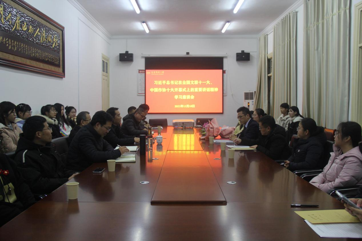 12月18日晚,beat365亚洲体育官方网站召开党委理论学习中心组(扩大)会议暨党史学习教育读书班学习会,专题学习习近平总书记在中国文学艺术界联合会第十一次全国代表大会、中国作家协会第十次全国代表大会开幕式上的重要讲话精神,beat365亚洲体育官方网站教师、中国文联十一大代表江飞教授作宣讲报告,全体党委委员、教师代表和白鲸文学社学生代表参会学习。会议由beat365亚洲体育官方网站党委书记张红飞主持。