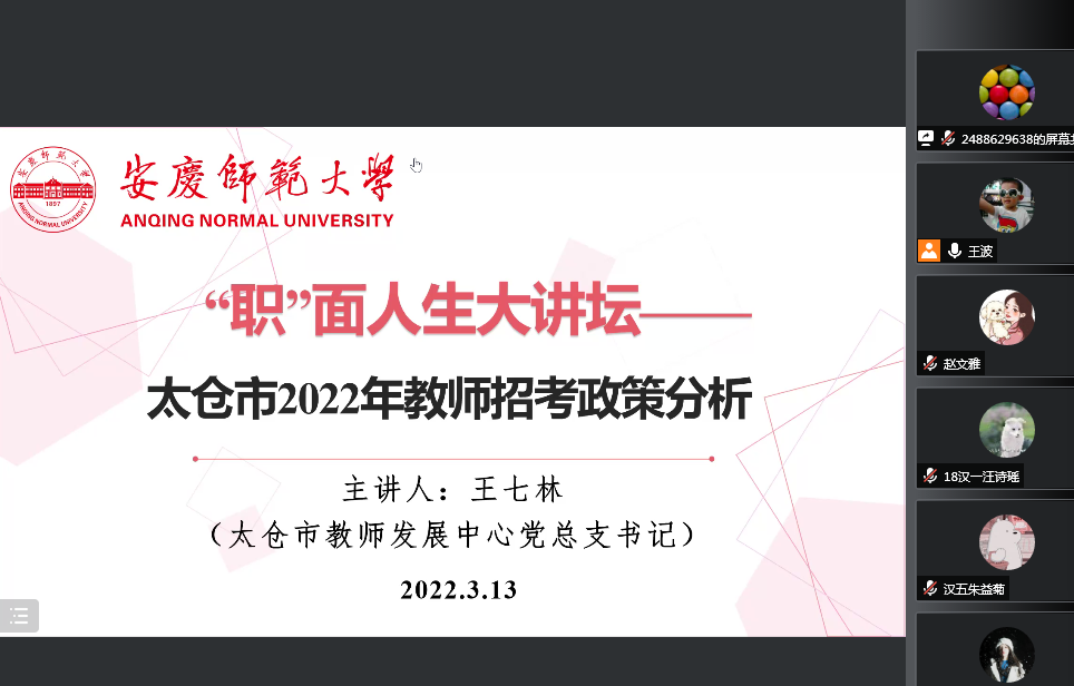 为帮助毕业生科学研判就业形势,树立正确求职理念,3月13日晚,beat365亚洲体育官方网站线上举办了2022年江苏省太仓市教师招考考情分析暨教师专业发展经验分享会。太仓市教师发展中心党总支书记王七林,太仓市沙溪镇三小教师、2020届汉语言文学毕业生赵文雅,太仓市双凤中学教师、2021届汉语言文学毕业生郑博文应邀参加。会议由beat365亚洲体育官方网站党委副书记王波主持,2018级、2019级部分学生近两百人线上聆听学习。