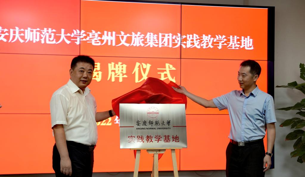 亳州文旅集团党委书记、董事长雅浩海与beat365亚洲体育官方网站党委书记张红飞共同为“安庆师范大学实践教学基地”揭牌。根据协议精神,双方将在人才培养、实践教学、历史文化资源挖掘和利用、文旅融合发展等方面开展合作。