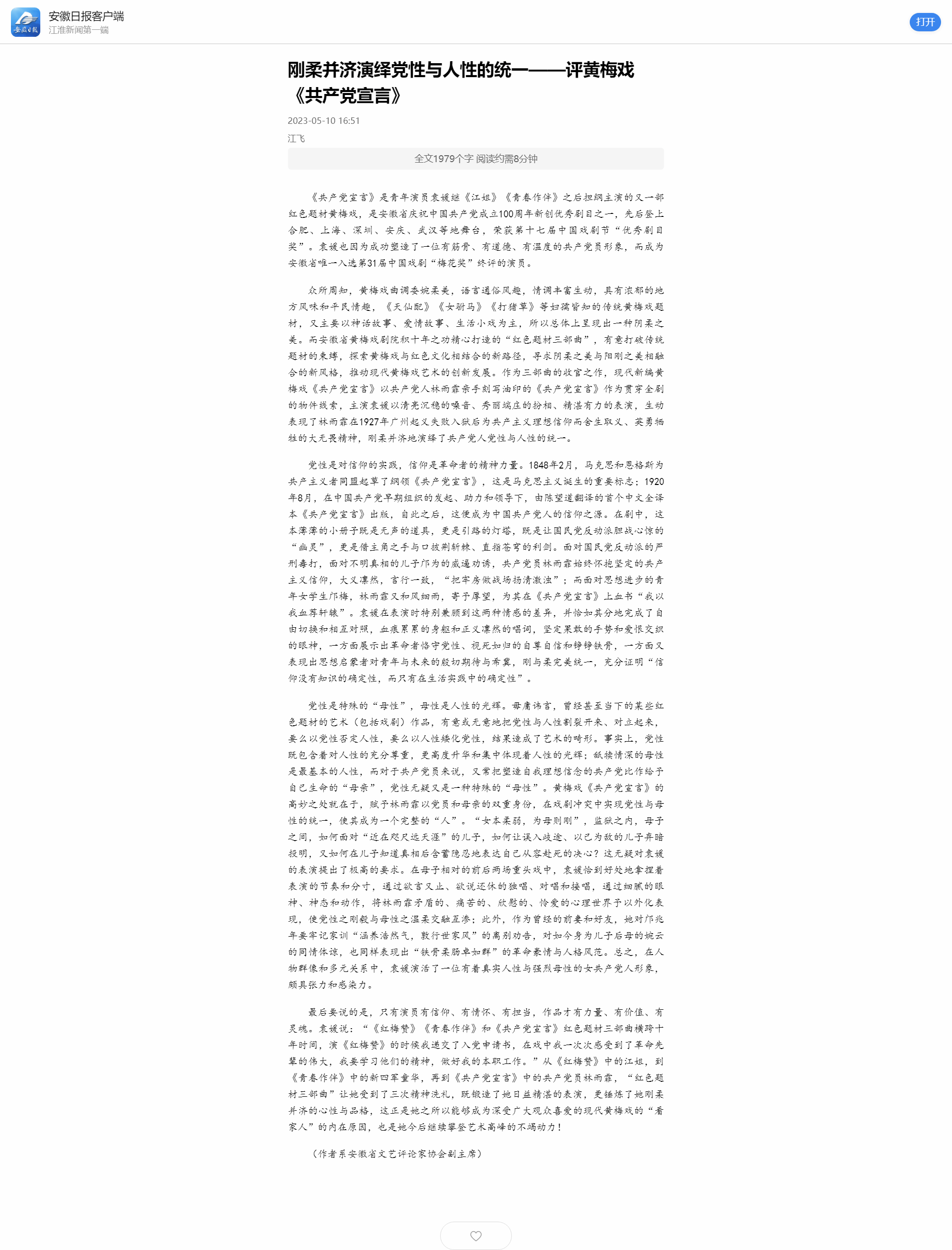 近日,《安徽日报》刊发beat365江飞教授撰写的评论文章《刚柔并济演绎党性与人性的统一——评黄梅戏<共产党宣言>》。该文以现代新编黄梅戏《共产党宣言》为例,阐述了现代黄梅戏创作积极探索黄梅戏与红色文化相结合的新路径,积极宣扬作品主人公为共产主义理想信仰而舍生取义、英勇牺牲的大无畏精神,褒扬了主演刚柔并济地演绎了共产党人党性与人性的统一。