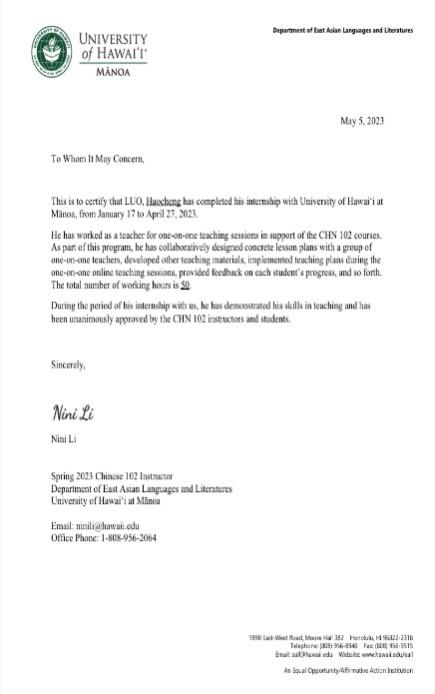 近日,beat365亚洲体育官方网站组织并参与实施的“2023年春季美国夏威夷大学东亚语言文学系在线中文单班课”实践项目第一期圆满完成。本次线上国际中文教学实践为期十四周,beat365亚洲体育官方网站24名师生顺利完成授课任务并获得夏威夷大学的实习证明。