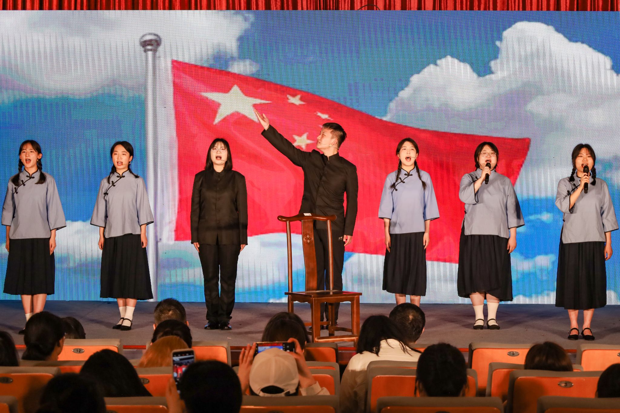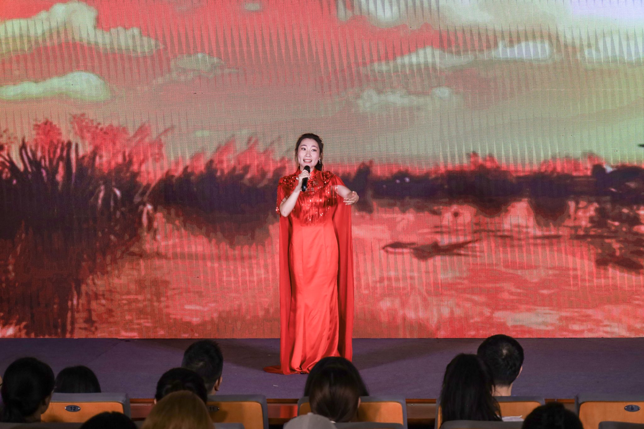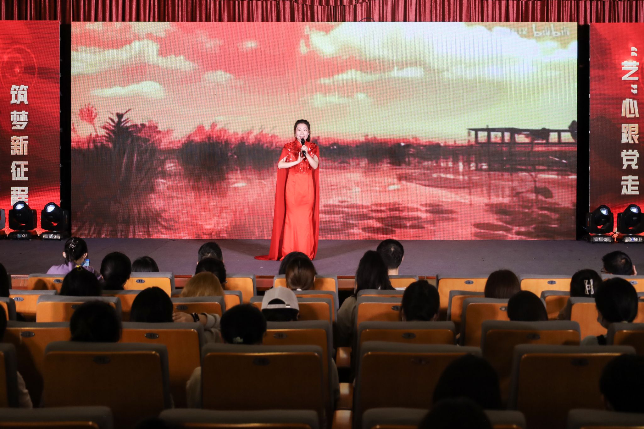 “共产党的恩情,比那东海还深。”“唤醒百花齐开放,高歌欢庆新春来,新春来……”黄梅戏表演专业2021(1)班的吴银梅一袭红衫,缓步上台,带来歌曲《洪湖水浪打浪》和《红梅赞》。两首红色歌曲节奏舒缓,将党的恩情娓娓道来,展现出浓厚的革命精神,打动了在场全体师生。“我很荣幸,能用自己的专业所学来表达对党的赞美和钦佩之情。”吴银梅表示。