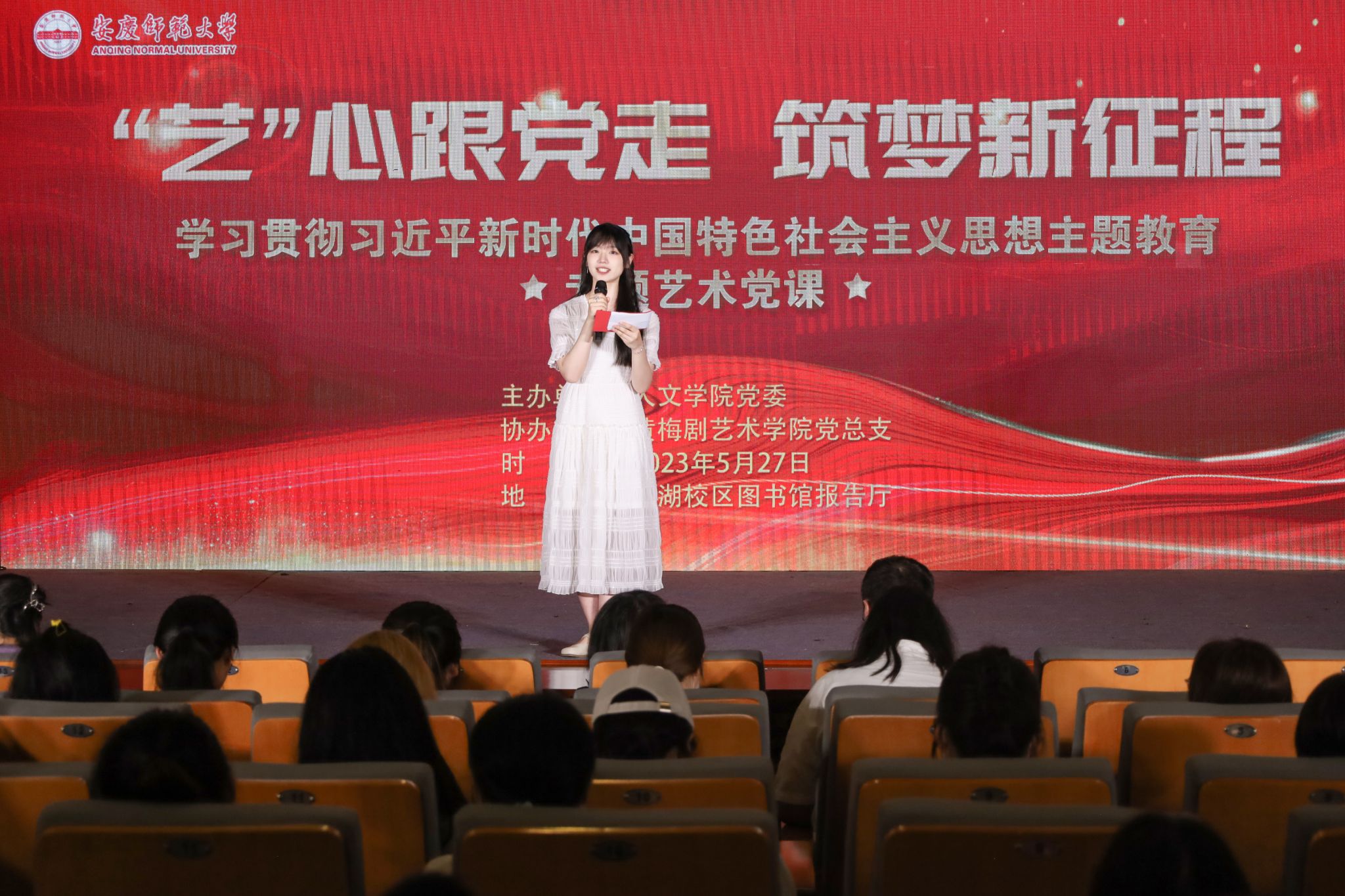 5月27日,一场主题为“艺心跟党走,筑梦新征程”——学习贯彻习近平新时代中国特色社会主义思想主题教育专题艺术党课在菱湖校区图书馆报告厅拉开帷幕。校党委组织部副部长吕佳、beat365亚洲体育官方网站党委副书记王波、黄梅剧艺术学院副院长刘国平出席活动,两院学生党支部书记等教师代表、第67期入党积极分子、第3期青马班学员近230余人到场观看。