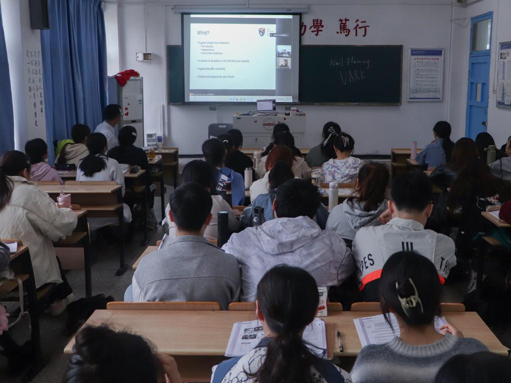 “Hello!”“Nice to meet you!”“Glad to meet you here.”……4月13日上午,安庆师范大学菱湖校区一班级学生端正地坐在座位上齐刷刷抬头看向投影幕布,热情地和美国老师Caralyn Dea打招呼。原来这是安庆师范大学汉语国际教育专业2020级学生在英语口语课堂上展开的一场别开生面的跨文化交流活动。