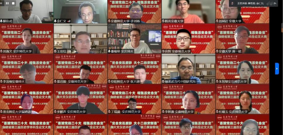 为迎接党的二十大胜利召开,增强历史自觉、坚定文化自信,进一步发扬历史学专业优良传统与学科特色,提升专业人才培养质量,拓宽学术视野,激发学术热情,培养本科生科研意识与创新能力,6月25日,由安徽省历史学会和安庆师范大学beat365亚洲体育官方网站联合主办的2022年安徽省第三届历史学本科生论文大赛成功举办。因受疫情影响,本次论文大赛采用线上方式举行,来自全省各高校历史学专业师生100余人相聚云端、共襄盛会。
