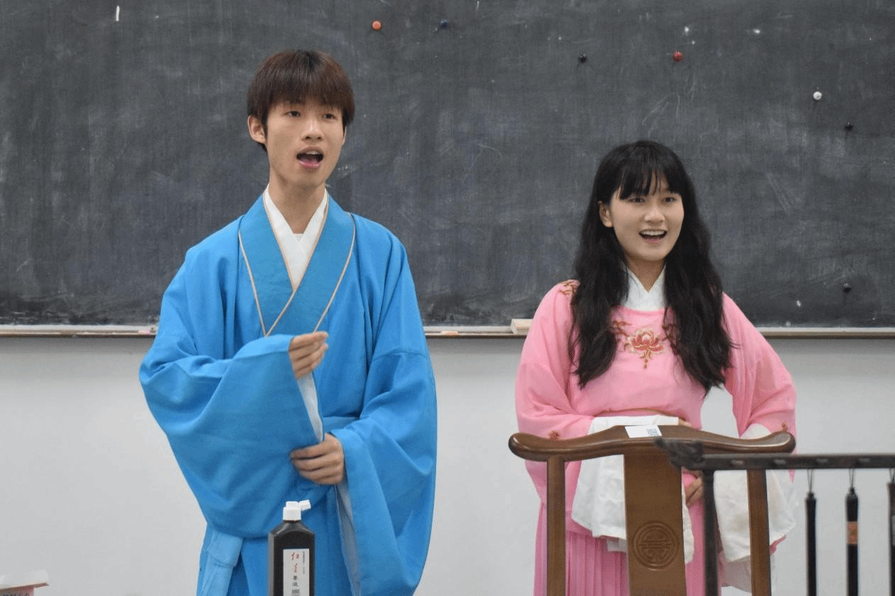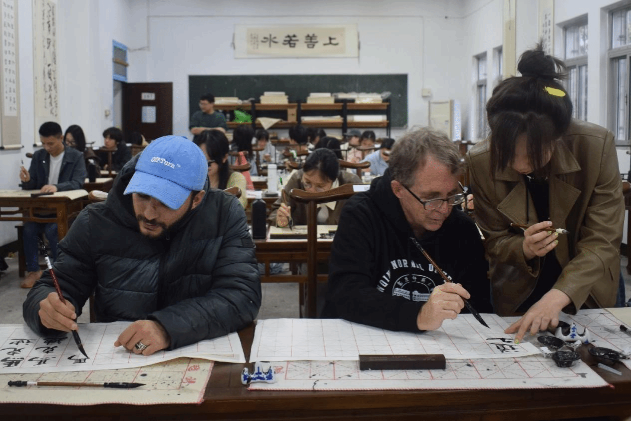 “握笔时主要是用右手的食指发力,笔要保持直立的状态。”……来自2022级汉语国际教育的马跃源同学向外籍师生及同学们展示书法要点。随后,外籍师生及汉语国际教育学生在黄梅剧艺术学院学生的带领下学习黄梅戏唱腔要点。外籍师生与汉语国际教育学生共同参与成语接龙游戏。在“中文+线上文化展”平台上,外籍师生共同观看视频,进一步了解中国文化。