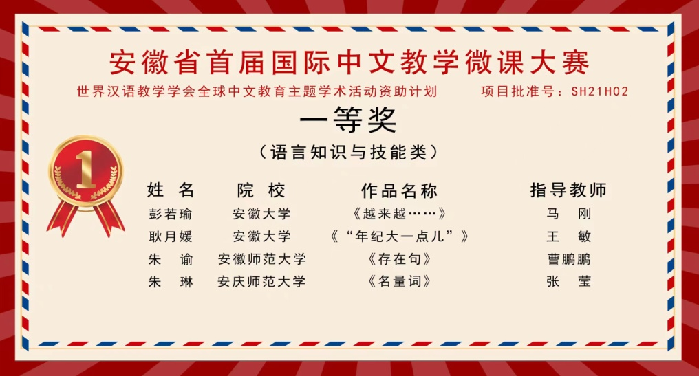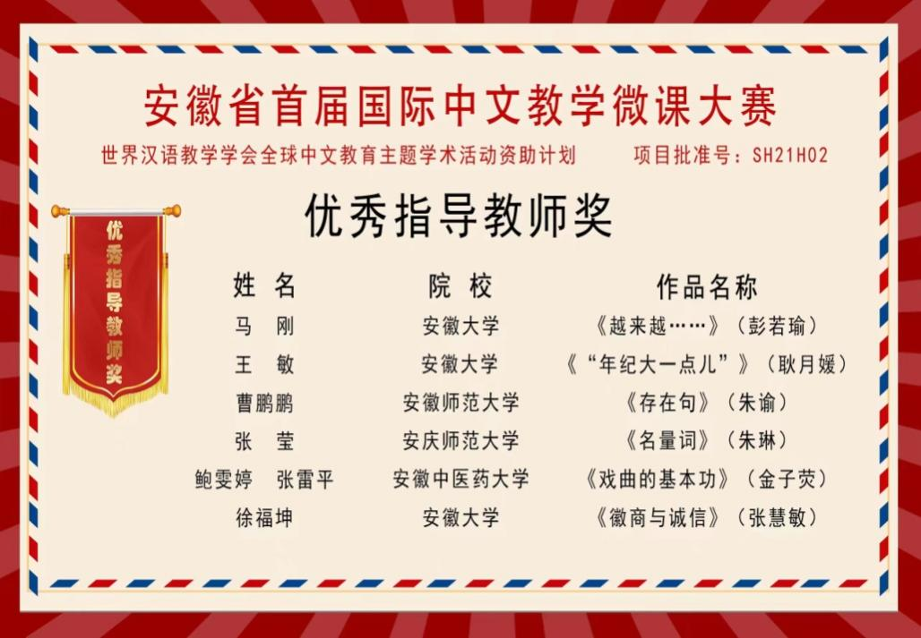 2022年11月20日,由世界汉语教学学会全球中文教育主体学术活动资助、安徽省汉语国际教育研究会主办、安徽大学文学院和安徽农业大学外国语学院承办的安徽省首届国际中文教学微课大赛评选结果揭晓。beat365亚洲体育官方网站2019级汉语国际教育专业朱琳同学荣获一等奖;2019级汉语国际教育专业梁嘉越同学、朱慧同学荣获优秀奖;张莹老师荣获优秀指导教师奖。